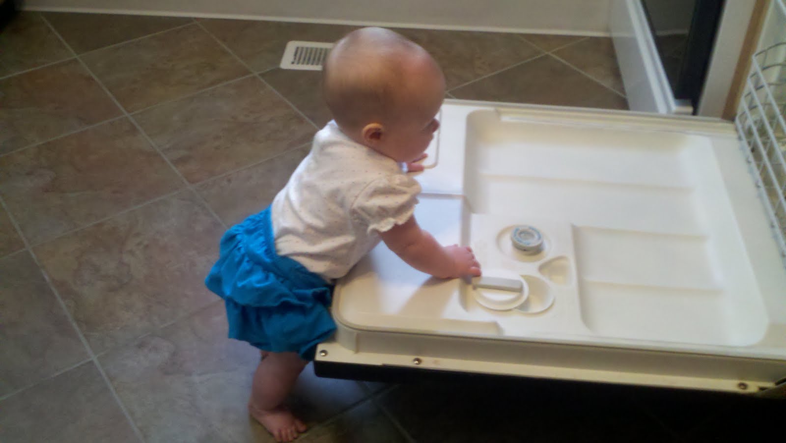 I was cleaning out the dishwasher yesterday and when I turned around to find Rosalie standing up, looking inside. This is the first thing she's found that she can truly pull herself up on; everything else is too high up or too low for her to use.